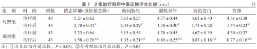 选取台州市立医院收治的86例晚期乳腺癌患者(辨证标准符合肝郁痰凝型辨证标准,纳排标准明确)按随机数字表法分为对照组及观察组各43例。2组资料差异均无统计学意义(P>0.05)。4周为1个疗程,2组均连用4个疗程。