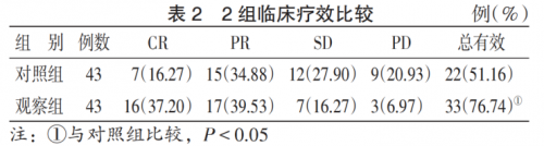 治疗后,观察组总有效率为76.74%,对照组为51.16%,P<0.05。见表2。