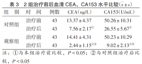 治疗后,2组血清CEA、CA153水平均较治疗前下降(P<0.05),观察组低于对照组(P<0.05)。见表3。