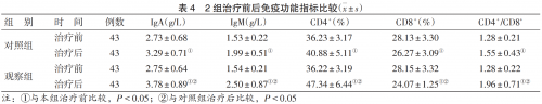 治疗后,2组免疫功能指标值均较治疗前改善,观察组改善情况优于对照组,且P<0.05。见表4。